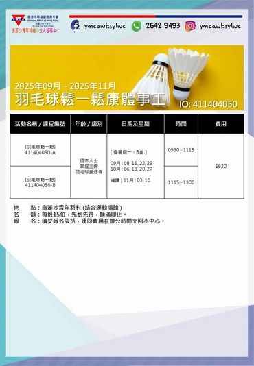 逢星期一在馬鞍山YMCA,早上有羽毛球訓練班 聯絡WhatsApp:94868718